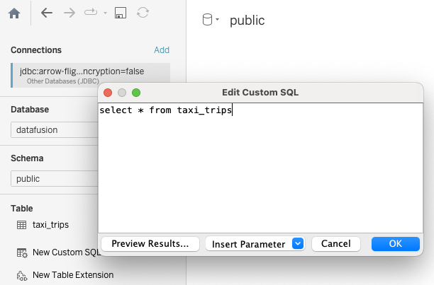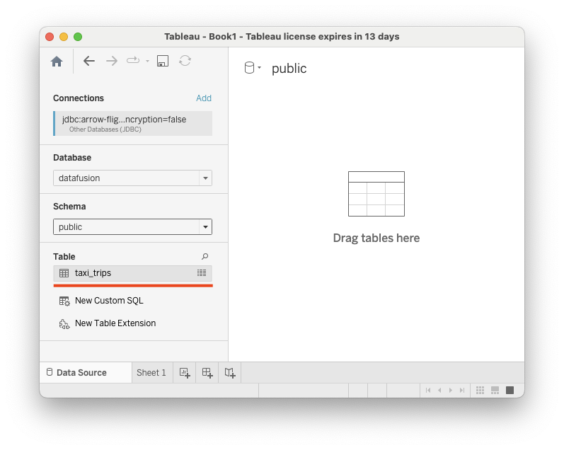 JDBC (Java Database Connectivity) is a standard way to connect to, and interact with a database. The Flight SQL driver is a JDBC driver implementation that utilizes the underlying Flight SQL protocol, allowing any program that connects via JDBC to seamlessly connect and interact with databases that support Flight SQL. Because Spice supports Flight SQL, this driver acts as a bridge, enabling Tableau to establish a connection with Spice, execute queries, and retrieve data.